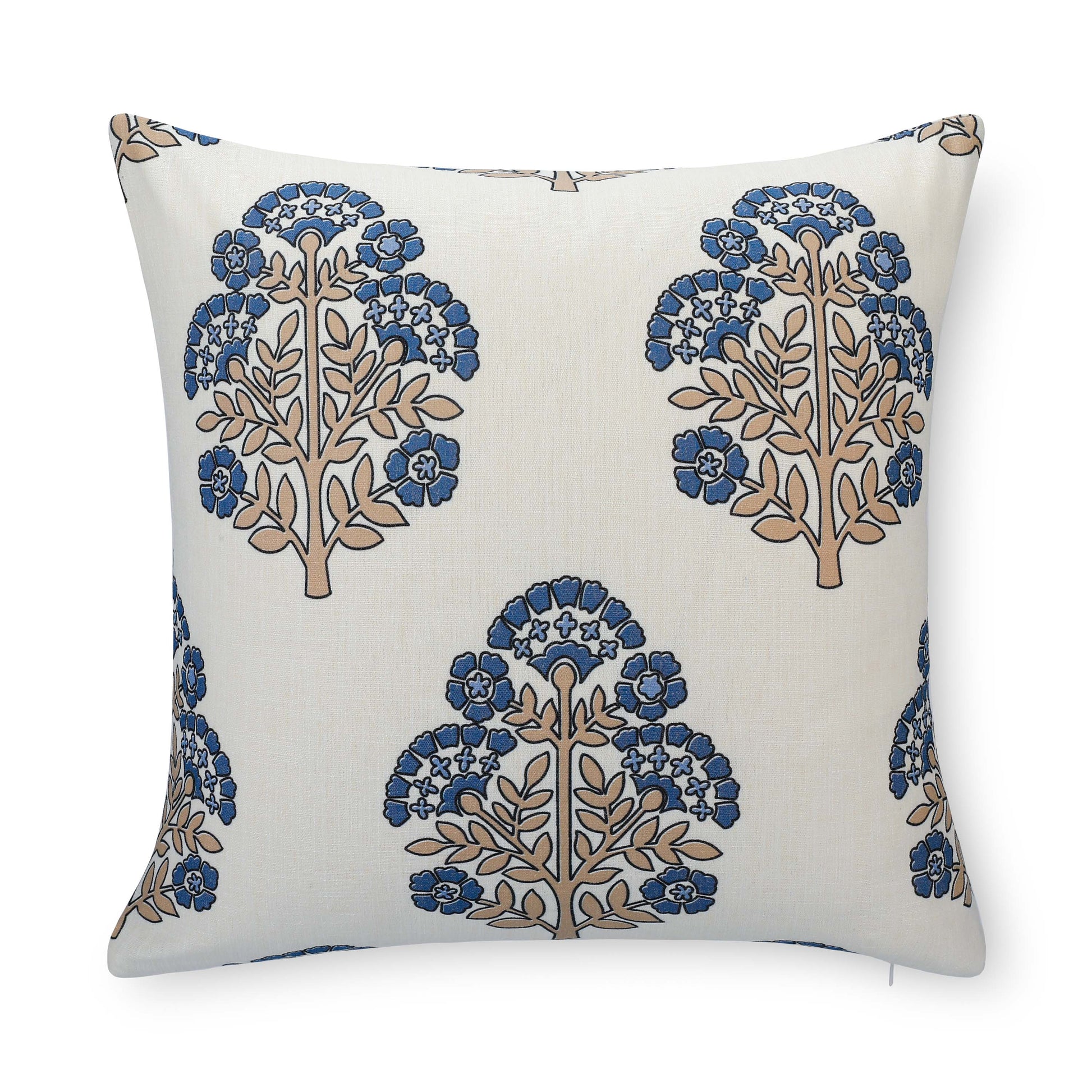 Avalora Indoor Outdoor Throw Pillow Cover, Block Print Hydrangea Flowers, Earth Tone Tan Azure Blue, 20"x20"