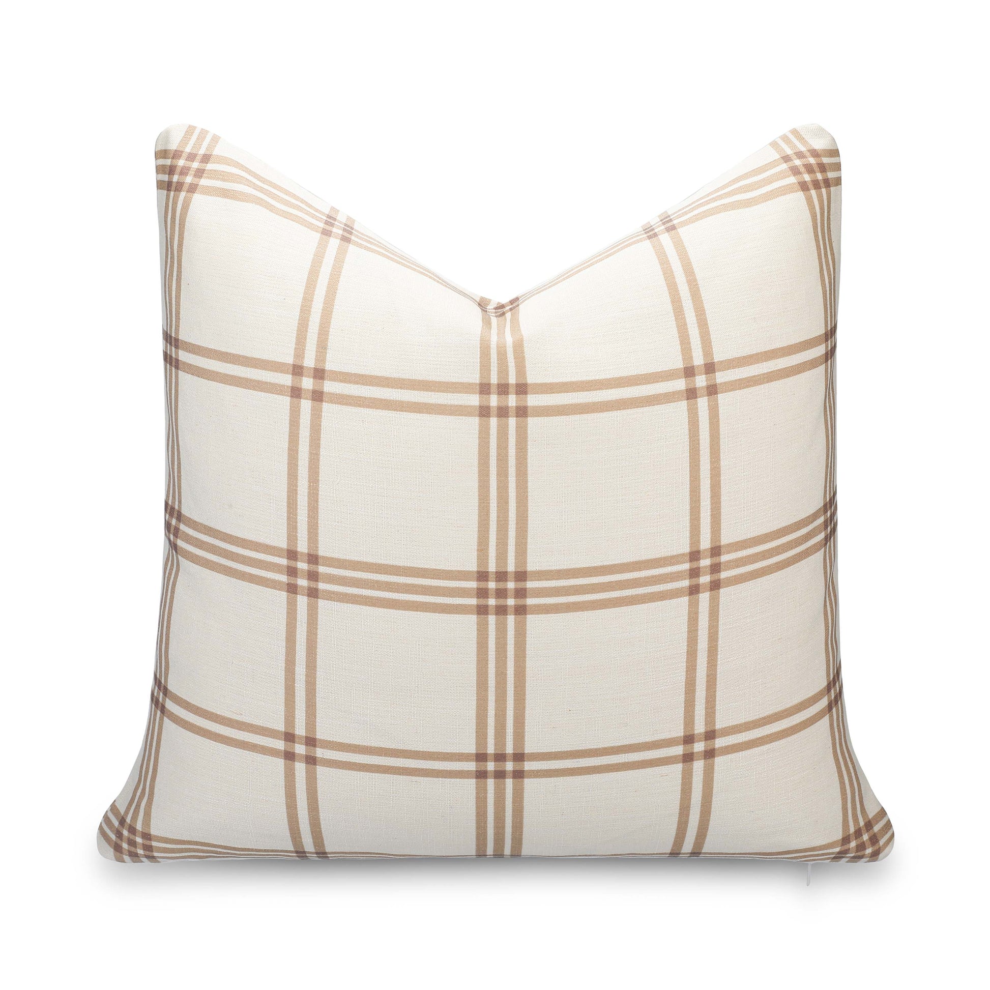 Showcasing a tan and dark khaki plaid on an ivory cream base, this indoor outdoor tan throw pillow cover brings relaxed warmth and effortless charm. Its reversible design allows versatile styling for cozy spaces that blend contemporary comfort with timeless, worldly appeal.