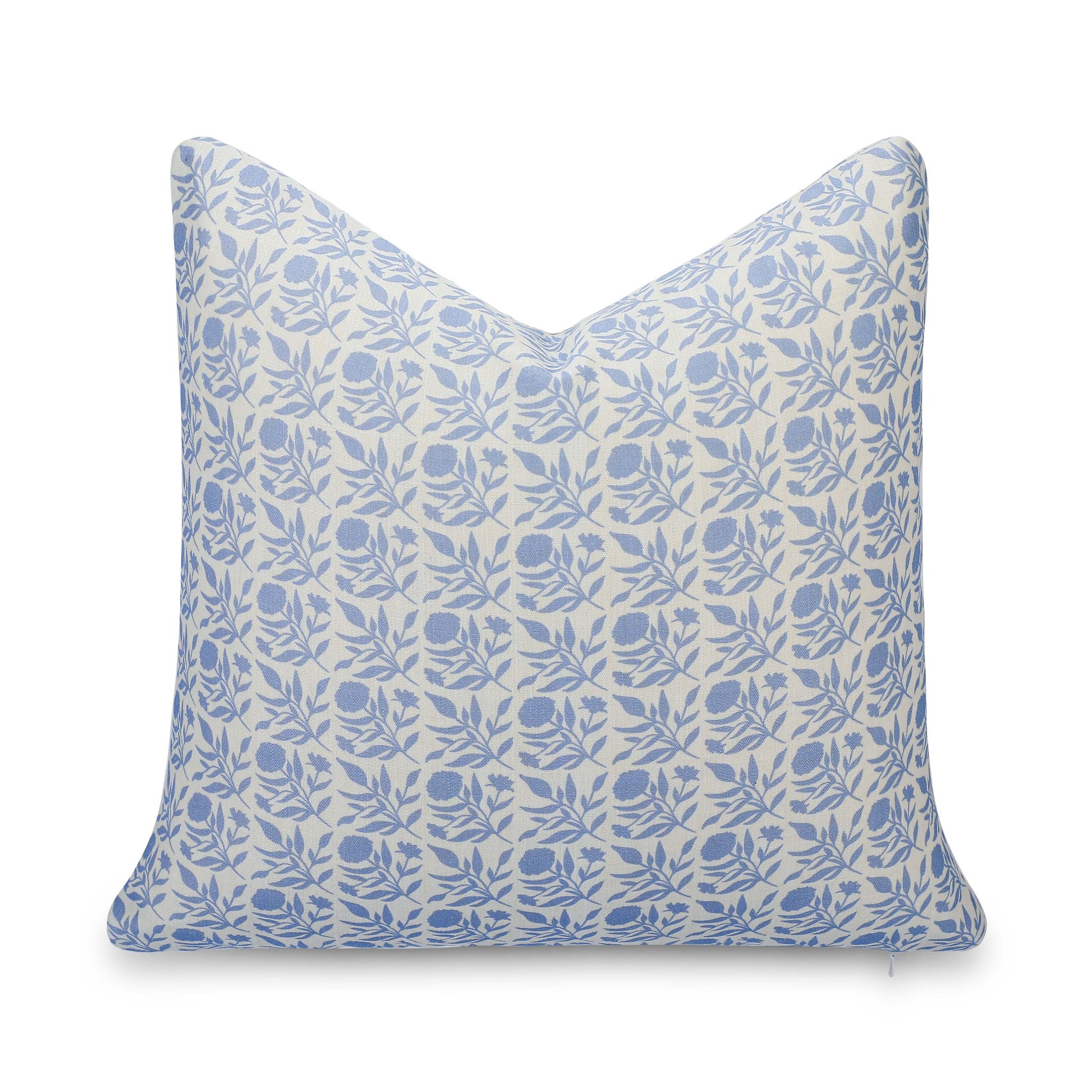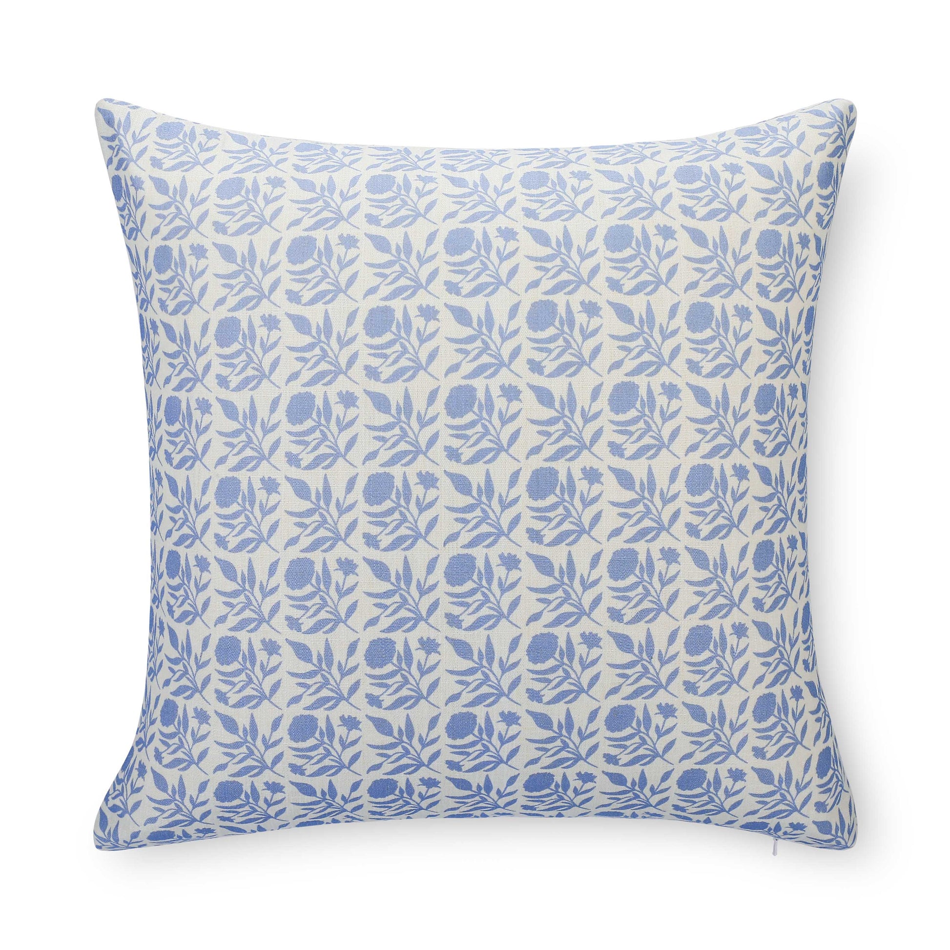 Featuring light blue floral and leaves geometric prints on an ivory cream base, this indoor outdoor blue pillow cover brings relaxed, breezy charm. The reversible side in a soft tone adds subtle depth and effortless layering for inviting, contemporary spaces.