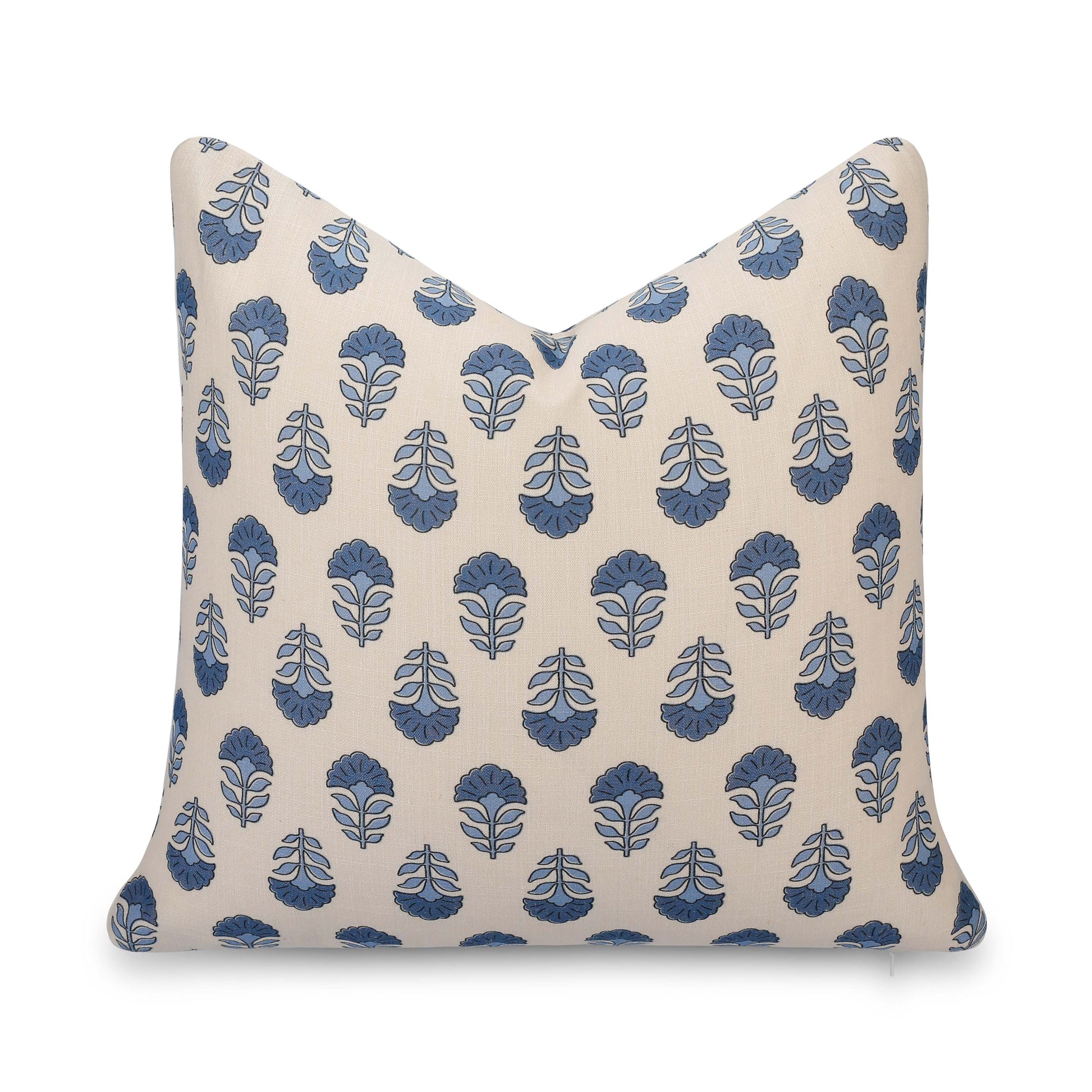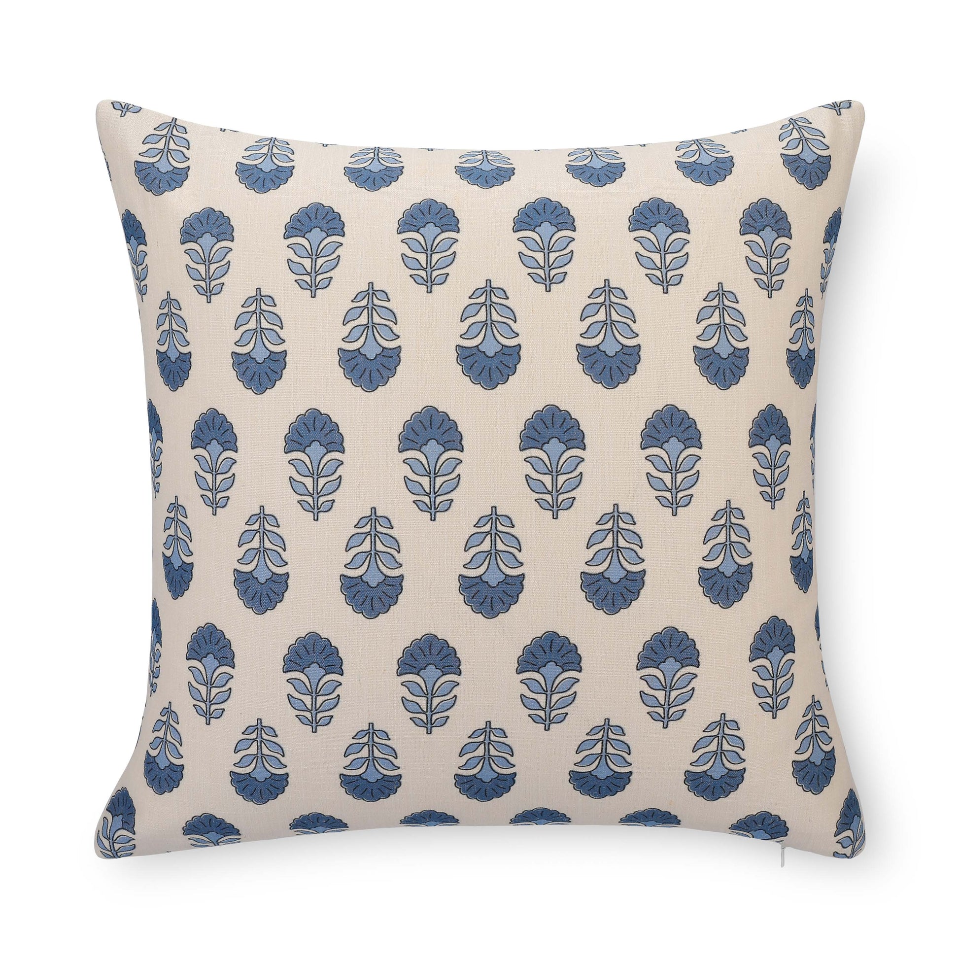 Presenting azure blue block print flowers on a neutral tan background, this indoor outdoor blue pillow cover adds airy sophistication. The repeated design on both sides highlights delicate blossoms, bringing relaxed coastal charm with subtle worldly character.