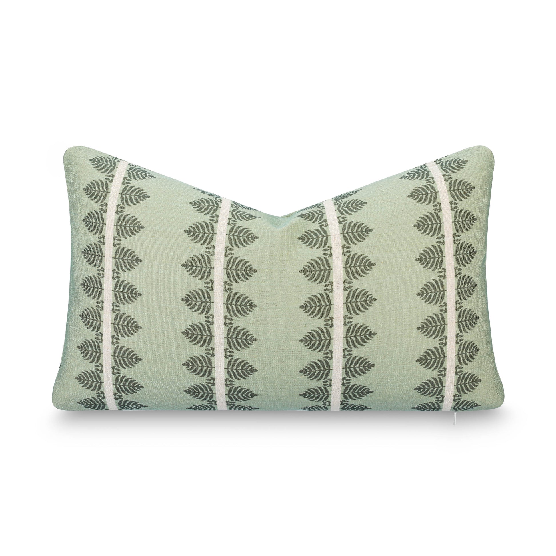 Highlighting olive leaves and ivory cream stripes on a soft green base, this indoor outdoor striped lumbar pillow cover brings relaxed, breezy charm. Its reversible side adds subtle balance and layered, worldly-inspired texture for airy, inviting spaces.
